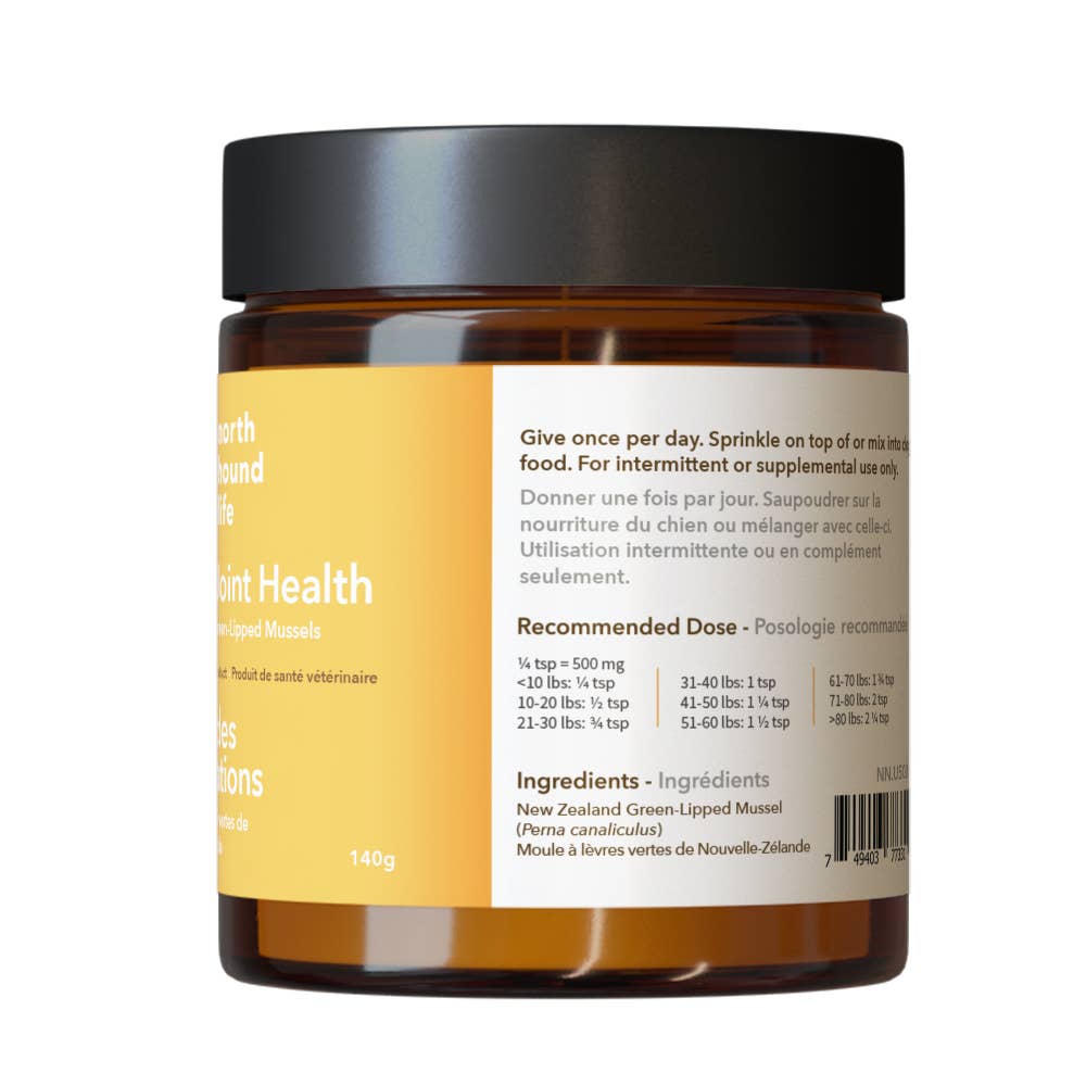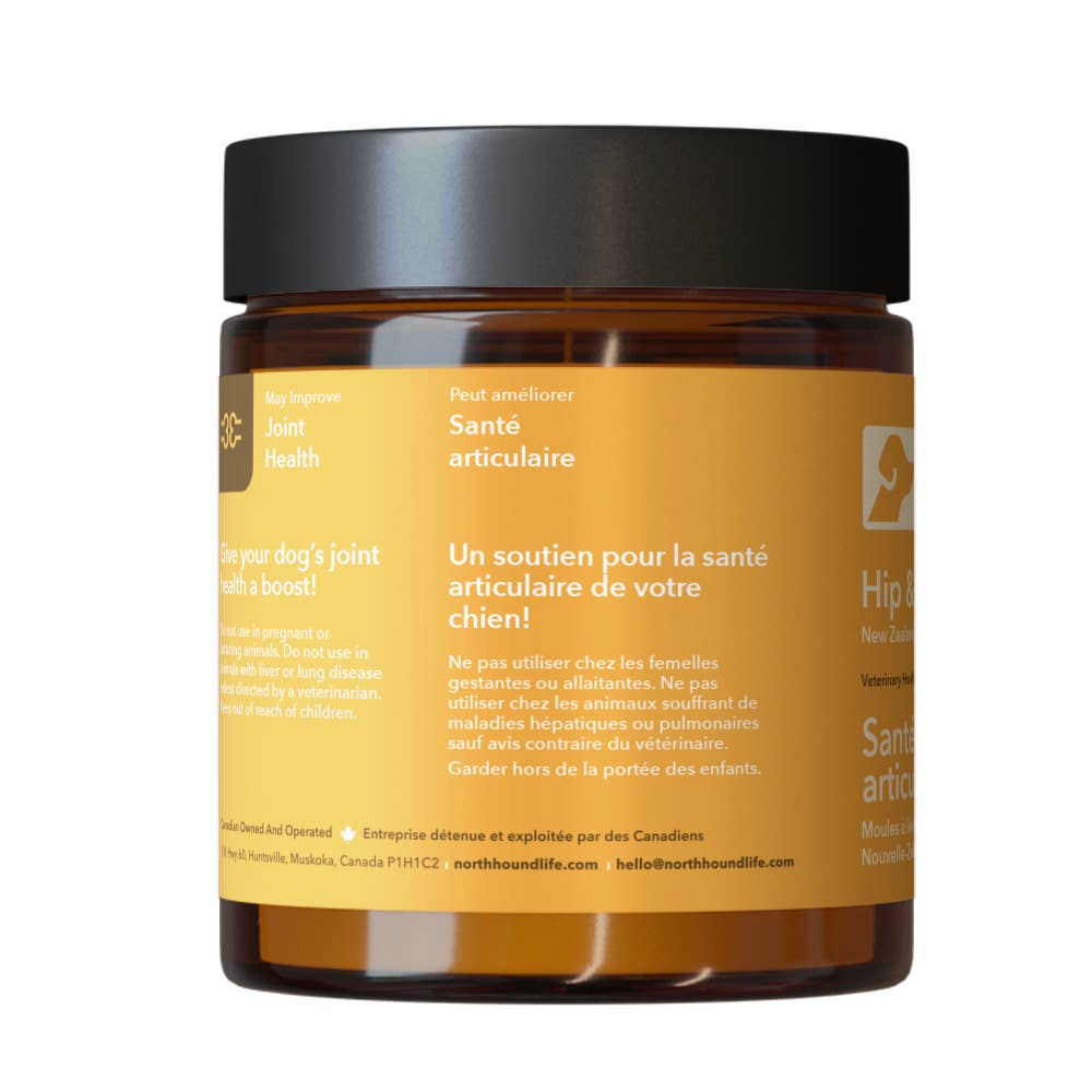 Hip & Joint Health is a natural joint support supplement that can help control joint pain and inflammation in dogs. Ideal for dogs showing signs of pain or stiffness, this whole food supplement supports your dog’s flexibility and comfort, improving their quality of life and giving them back their energy. From controlling inflammation to rebuilding cartilage, green-lipped mussel is a natural way to support your aging dog’s joint health. Hip & Joint Health can be a gentle and effective alternative to harsher NSAIDs. As a whole food, it offers a complex blend of nutrients that work together naturally and may improve absorption. It’s an ideal choice for dogs who need extra support in healing painful joints without the side effects of over-the-counter medications. Native to New Zealand, green-lipped mussels are a source of eicosatetraenoic acid (ETA), a rare omega-3 fatty acid that’s shown to be particularly effective at calming joint inflammation. They’re also rich in cartilage-repairing minerals and full of antioxidants that help protect joint tissues from the effects of aging and inflammation. This marine-based whole food is rich in glycosaminoglycans (GAGs), with compounds including glucosamine and chondroitin sulfate. Note on Packaging: This product is part of a packaging transition. While the formula remains exactly the same, you may receive either our original or updated packaging as we work through inventory. Both are 100% authentic North Hound Life.